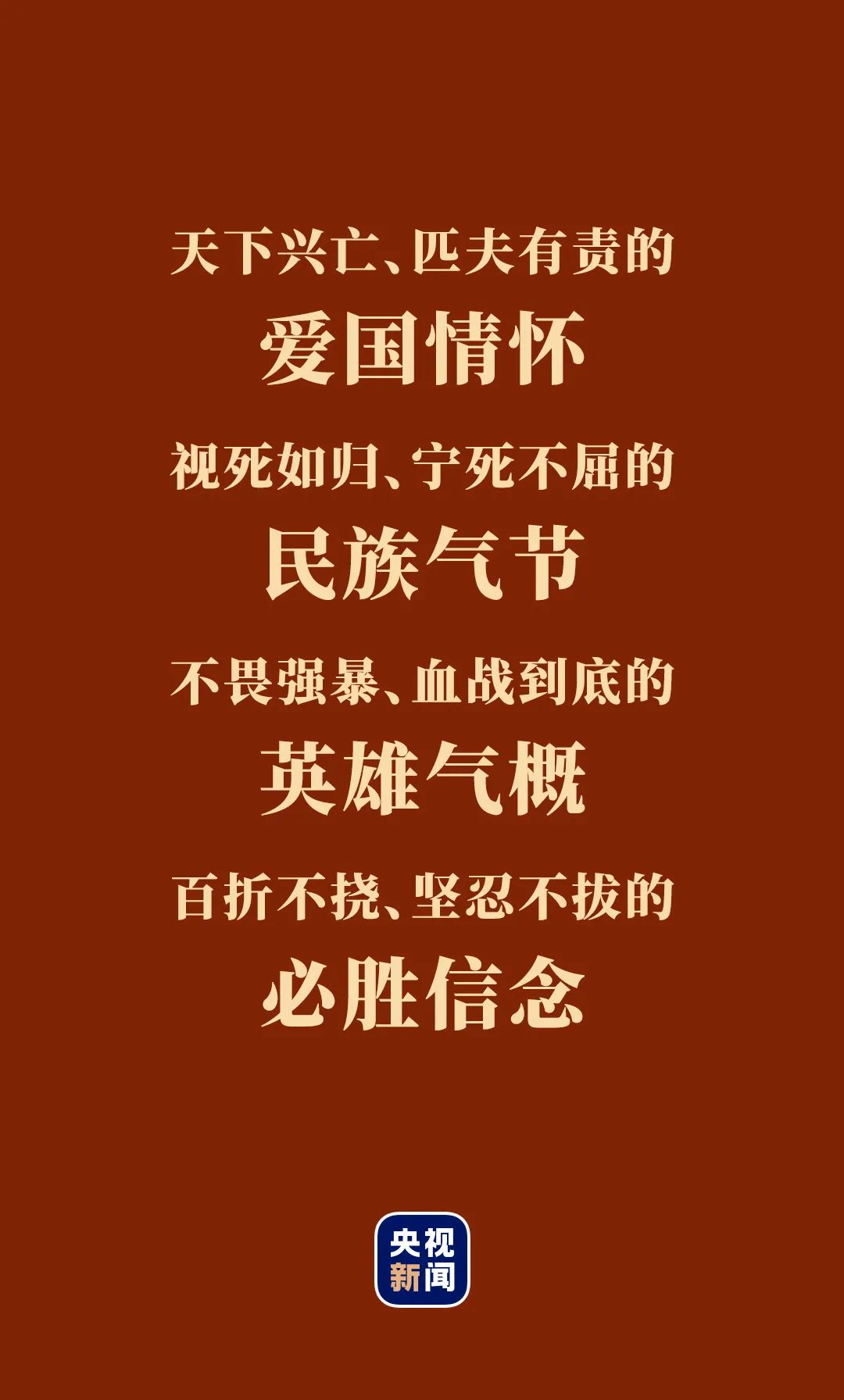以枯草、樹皮和棉絮果腹的楊靖宇,只身與敵人周旋直至犧牲;親筆寫信告諭官兵為國家民族死之決心決不改變的張自忠,戰(zhàn)斗到生命的最后一刻;面對步步逼近的日偽軍,“狼牙山五壯士”縱身跳下懸崖……中國人民以錚錚鐵骨戰(zhàn)強敵、以血肉之軀筑長城、以前仆后繼赴國難,譜寫了驚天地、泣鬼神的雄壯史詩。