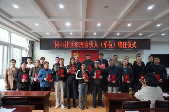 圖為同心社區(qū)黨總支與社區(qū)治理合伙人、治理合伙單位聘任儀式現(xiàn)場
