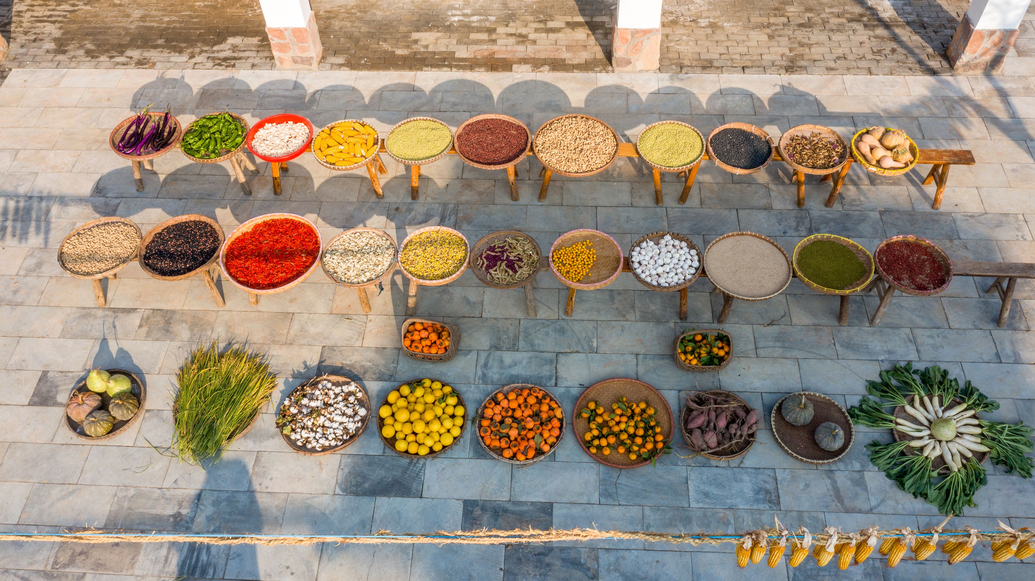 通過尋秋、曬秋、展秋,將玉米、柿子、辣椒、花生等一系列農(nóng)作物分裝晾曬于門前,紅彤彤的柿子、金燦燦的玉米、火紅的辣椒……各種瓜果在陽光的照耀下彌漫清香,繪成了一幅五彩斑斕的農(nóng)俗畫卷,形成一場(chǎng)關(guān)于秋的視覺盛宴。