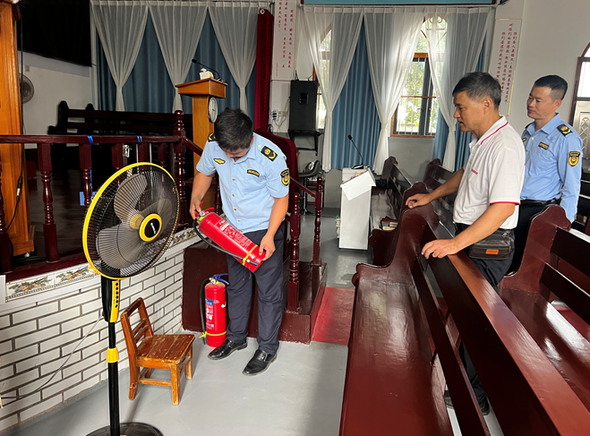 檢查中,檢查人員以查、看、聽方式對宗教活動場所內殿堂、廚房、僧舍等可能存在火災隱患的場所和角落進行全面細致的檢查,重點檢查滅火器是否保持完好和能否有效使用,寺廟內是否存在電線老化、線路裸露等情況進行檢查。