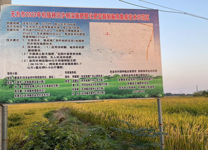 無為市2023年機插秧同步側(cè)深施肥暨化肥定額制施用集成技術(shù)示范區(qū)創(chuàng)建規(guī)模涉及10個鎮(zhèn)、12個村,下莊村示范地點在下莊村民偉家庭農(nóng)場,核心區(qū)100畝,創(chuàng)建目標為畝產(chǎn)650公斤以上。