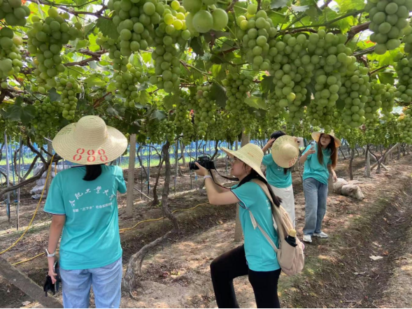 在新田地葡萄種植專業(yè)合作社的富有機(jī)硒巨峰葡萄基地,一串串飽滿多汁的葡萄掛滿枝頭,學(xué)生們直觀感受到豐收的喜悅。炎炎夏日里,大家走進(jìn)悶熱的大棚,親手采摘品嘗酸甜可口的葡萄,在味蕾享受的同時(shí),更真切體會(huì)到農(nóng)民種植的辛勞與不易。