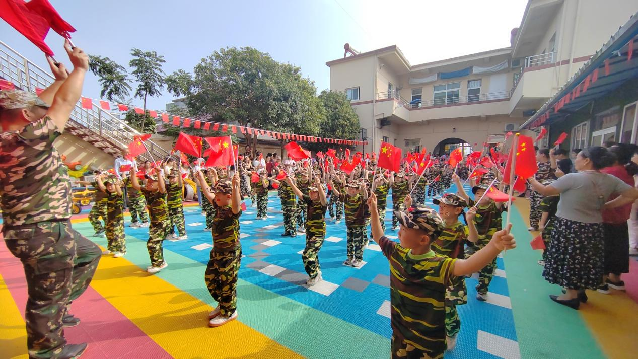 清晨,活動以莊嚴的升旗儀式拉開帷幕。“萌娃護旗隊”身著整齊迷彩服,邁著稚嫩卻堅定的步伐護送國旗入場,眼神中滿是專注。伴隨著雄壯的《義勇軍進行曲》,五星紅旗冉冉升起,全體幼兒挺直腰背、行注目禮,家長與社區(qū)志愿者肅立致敬,濃厚的愛國氛圍浸潤現(xiàn)場。升旗儀式后,各班幼兒依次展示旗操:孩子們手持小國旗,踩著節(jié)奏整齊列隊,揮旗、轉(zhuǎn)身、踏步等動作連貫有力。