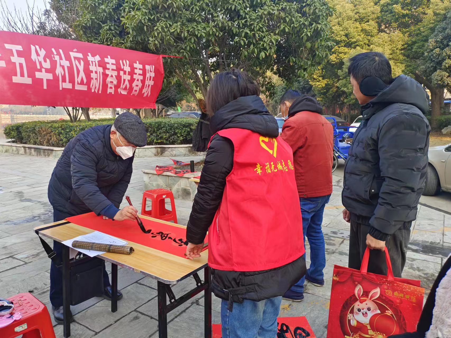 臨近新年佳節(jié)之際,2023年1月9日上午,無(wú)城鎮(zhèn)五華社區(qū)聯(lián)合徽商銀行攜手邀請(qǐng)書法協(xié)會(huì)三位書法家,在五華社區(qū)錦繡苑小區(qū)廣場(chǎng)現(xiàn)場(chǎng)書寫春聯(lián)免費(fèi)贈(zèng)與居民,為即將到來(lái)的新春節(jié)日營(yíng)造喜慶的氛圍。