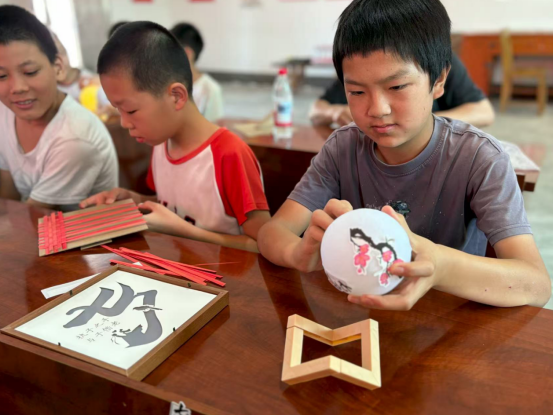 隨后,在手工制作環(huán)節(jié),志愿者們給小朋友們發(fā)放手工制作材料,為低齡孩子發(fā)放月球燈、為年齡大一點的孩子發(fā)放非遺竹編畫。小朋友們拿到材料,迫不及待地開始制作。小朋友們在志愿者的指導(dǎo)下,有的用積木塊拼接底座,用貼紙給月亮貼上不同的圖案,有的用竹條一壓一穿制作竹編畫……大家互相交流著制作心得和體會,臉上洋溢著幸福的笑容。在小朋友的巧手下,一個個充滿美好祝福和寓意的七夕節(jié)竹編畫和月球燈制作完成,大家進行合影留念。