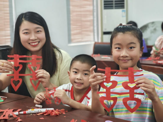 活動(dòng)現(xiàn)場設(shè)置了“巧手剪喜”環(huán)節(jié),為孩子們準(zhǔn)備好剪刀、紅紙等材料,由社區(qū)志愿者手把手教導(dǎo)孩子們剪裁“萌萌的喜字”。孩子們?cè)趯W⒌膭?dòng)手過程中,還能聆聽志愿者講述牛郎織女鵲橋相會(huì)的“七夕”小故事,讓孩子們?cè)凇巴嬷鴮W(xué)”的輕松氛圍里,自然而然了解傳統(tǒng)節(jié)日的文化內(nèi)涵。