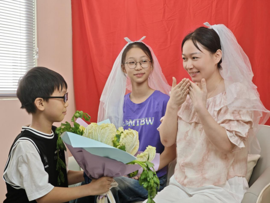 “蔬菜變花束”環(huán)節(jié)堪稱本次活動(dòng)的“創(chuàng)意亮點(diǎn)”。社區(qū)提供了新鮮多樣的蔬菜,搭配色彩鮮艷的包裝紙、絲帶等材料,鼓勵(lì)家長與孩子共同發(fā)揮想象力,將芹菜、白菜、彩椒、西藍(lán)花等常見蔬菜制作成造型別致的“蔬菜花束”。這一過程不僅能鍛煉孩子的動(dòng)手能力與創(chuàng)造力,還能讓他們重新認(rèn)識(shí)“食材之美”。