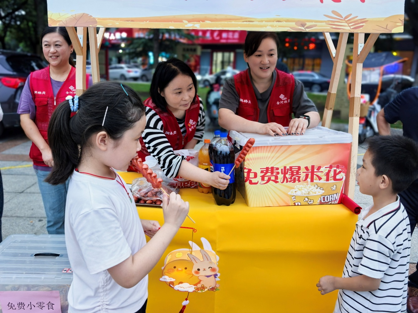 中秋花燈制作區(qū)則成為親子互動的樂園,家長與孩子攜手折疊、粘貼,一盞盞造型各異的中秋花燈在笑聲中點亮,提前傳遞節(jié)日的溫馨?!耙娮秩缑妗睂^(qū)墨香氤氳,書法老師揮毫寫下“萬事順遂”“鄰里一家親”等祝福語,居民們爭相領(lǐng)取這份手寫溫情。最受歡迎的,莫過于“免費零食攤位”,烤腸、爆米花,以及各種飲品等時令小零食供不應(yīng)求,居民王阿姨笑言:“邊吃邊逛,像過年一樣熱鬧!”