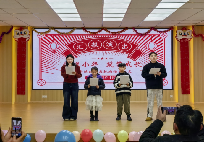 為豐富轄區(qū)青少年寒假生活,切實解決雙職工家庭假期“看護難”問題,2月12日下午,雙橋社區(qū)新時代文明實踐站開展“情暖小年 筑夢成長”暨寒假課堂結業(yè)匯報演出。家長代表、社區(qū)居民與志愿者、小學員們歡聚一堂,在溫馨熱烈的氛圍中,共同見證孩子們的成長蛻變與假期收獲。