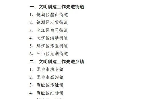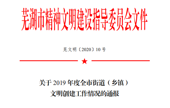 日前,根據(jù)中共蕪湖市委辦公室文件《關(guān)于實(shí)行市領(lǐng)導(dǎo)聯(lián)系街道(鄉(xiāng)鎮(zhèn))督查創(chuàng)建全國文明城市工作的通知》(蕪市辦〔2011〕33 號(hào))要求,經(jīng)市文明辦推薦上報(bào),結(jié)合蕪湖市文明辦日常檢查情況,蕪湖市文明委決定,授予鏡湖區(qū)赭山街道、無為市洪巷鎮(zhèn)等16個(gè)單位2019年度全市文明創(chuàng)建工作先進(jìn)街道(鄉(xiāng)鎮(zhèn))榮譽(yù)稱號(hào)。其中,無為市2鎮(zhèn)上榜。