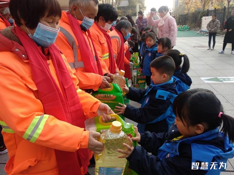 活動中,來自“城市美容師”的20名環(huán)衛(wèi)工人代表和幼兒園的20名孩子們歡聚在一起,小朋友們分別向環(huán)衛(wèi)工人獻(xiàn)上由幼兒園家委會提前購買的一條圍巾、一袋大米、一壺油,并道一聲“爺爺奶奶辛苦了!”環(huán)衛(wèi)工人由衷的向小朋友們表示感謝,對他們噓寒問暖,熱情相擁。