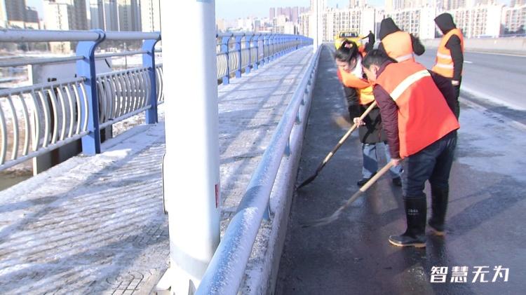 同樣,在城南比亞迪大橋上,記者看到市交通運(yùn)輸局養(yǎng)護(hù)人員正在對(duì)道路上的積雪、薄冰進(jìn)行鏟除,并撒放融雪劑,防滑料等,并在大橋兩端設(shè)立警示牌。