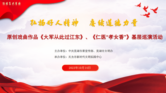 10月14日,原創(chuàng)戲曲作品《大軍從此過江東》、《仁醫(yī)“孝女香”》基層巡演活動在無為市青少年活動中心舉辦,活動由中共蕪湖市委宣傳部、蕪湖市文明辦主辦,無為市新時代文明實踐中心承辦。此次活動旨在大力弘揚(yáng)道德模范和身邊好人精神,著力提高人民道德水準(zhǔn)和文明素養(yǎng),通過藝術(shù)化形式對廣大群眾進(jìn)行思想政治教育,打通宣傳群眾、教育群眾、服務(wù)群眾的“最后一公里”,積極營造崇德向善、見賢思齊、積極向上的濃厚良好社會氛圍。