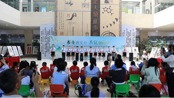 活動在《繁星》經(jīng)典片段朗讀中拉開帷幕,孩子們清脆悅耳的聲音,讓現(xiàn)場觀眾感受文學(xué)經(jīng)典的魅力。隨后,親子共讀《假如風(fēng)是有顏色的》,家長與孩子默契配合,交替誦讀,在閱讀中悄然拉近了親子間的距離?!队薰粕健非榫皠∮蒙鷦拥谋硌?,贏得陣陣掌聲。在閱讀分享環(huán)節(jié),兩名優(yōu)秀小讀者走上舞臺,分享自己最愛的一本書,講述書籍如何為他們打開新世界的大門?!稌銤櫉o為》朗誦快閃驚艷亮相,數(shù)十名朗誦愛好者從四面八方匯聚,以震撼的集體誦讀將活動推向高潮。