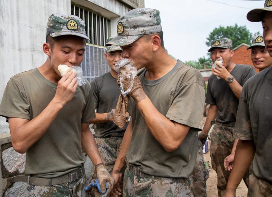 抗洪官兵吃到香噴噴的包子。楊明 攝
