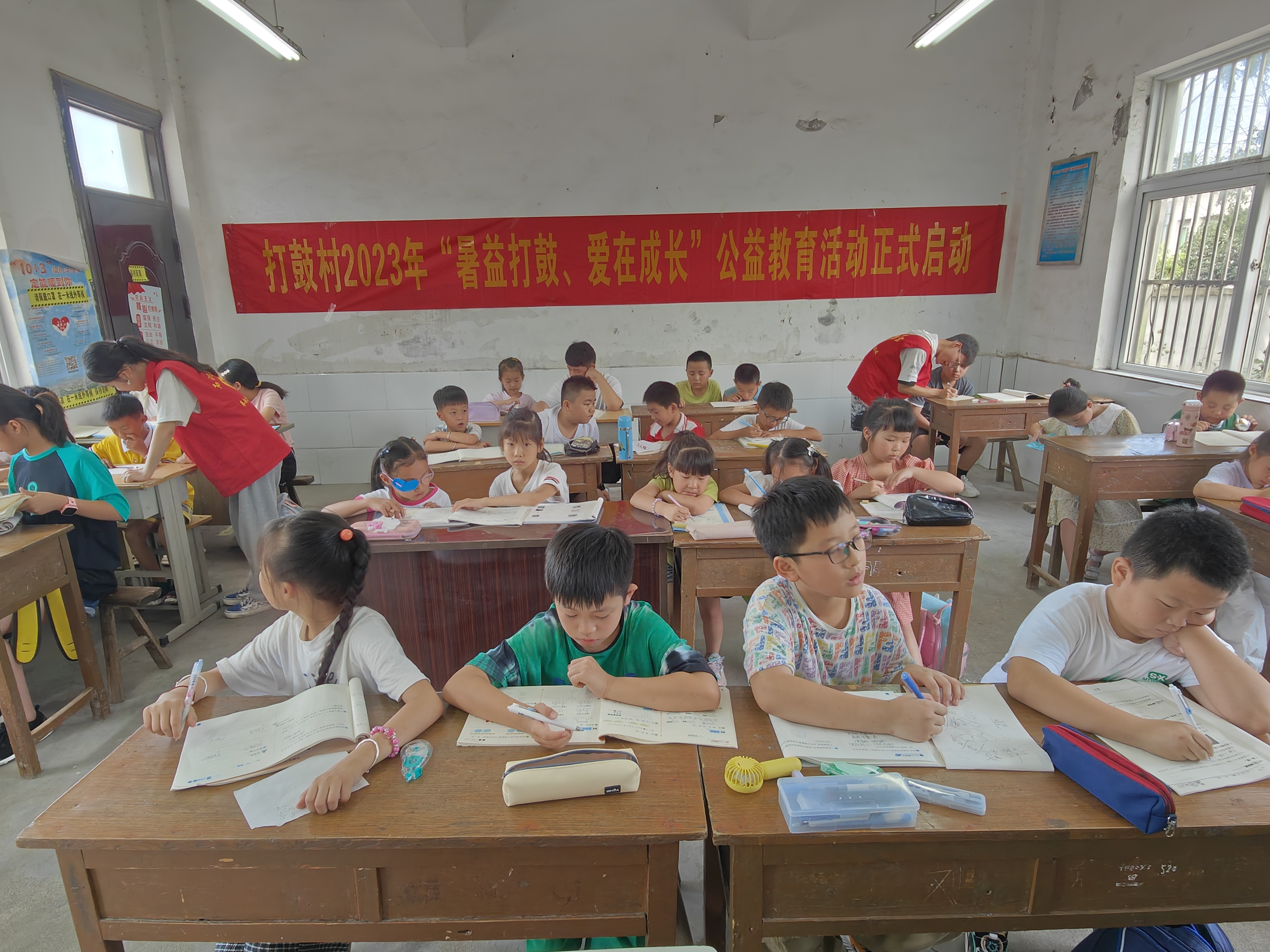 打鼓村姜書記在入戶走訪時發(fā)現(xiàn),暑假假期到來以后,村里的孩子多了起來,一些孩子的父母外出務(wù)工,導(dǎo)致孩子的課業(yè)無人輔導(dǎo),很多孩子懶散、沉迷于網(wǎng)絡(luò)電子產(chǎn)品。得知情況后,村支部書記當(dāng)機立斷,利用原打鼓小學(xué)教室,組織本村劉慧、秦鵬等5名已錄取大學(xué)生作為“老師”。