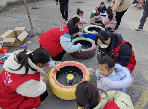 活動(dòng)當(dāng)天,幼兒園的小朋友們?cè)诶蠋煹膸ьI(lǐng)下來(lái)到了燃料公司宿舍,社區(qū)工作人員和志愿者早早地在空地上擺放著廢棄的輪胎、油漆、刷子等物品。小朋友們兩兩一組圍繞著輪胎手里拿著刷子開始發(fā)揮自己天馬行空的想象力,在小朋友創(chuàng)作的同時(shí),社區(qū)的垃圾分類講解員向小朋友們介紹了輪胎是屬于可回收垃圾,油漆是屬于有害垃圾等,讓孩子們?cè)谟螒蛑休p松掌握分類技巧,讓環(huán)保的種子深深地扎根心中。