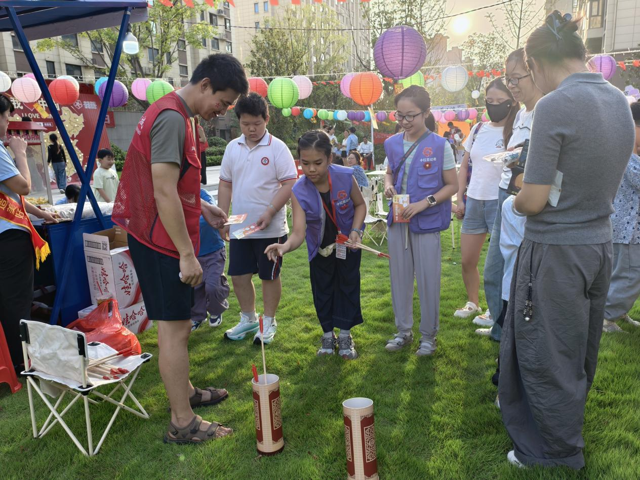 文明游戲區(qū)的投壺游戲,讓傳統(tǒng)民俗與“文明”理念碰撞出趣味火花。工作人員提前將投壺上貼上文明行為標(biāo)語,居民站在指定線外投擲,投中不同標(biāo)語的“箭”,即可獲得對應(yīng)文明行為的宣傳手冊。