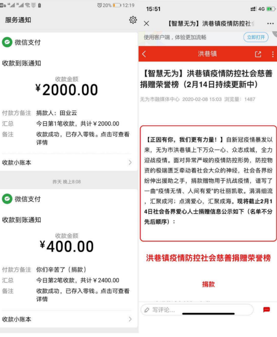 “喂,是范主任吧,我想捐款,能否提供一下賬戶?”2月2日,洪巷鎮(zhèn)新時代文明實踐所的范成輝接到了志愿者戴春敏的電話,不多久一筆1000元的匯款到賬;2月11日,志愿者田業(yè)云捐款2000元;2月14日,志愿者李榮貴捐款1000元......還有八筆匿名捐款,伴著一句簡單的“你們辛苦了”轉到了洪巷鎮(zhèn)新時代文明實踐所。目前為止,洪巷鎮(zhèn)新時代文明實踐所已收到53843元來自志愿者們的愛心捐款。