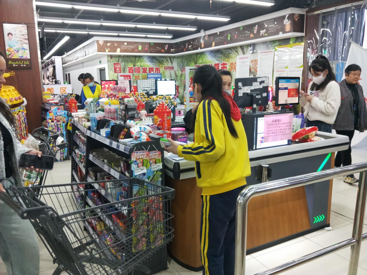 活動開始后,社區(qū)志愿者及老師指導孩子們?nèi)绾伟踩俗詣臃鎏?,如何根?jù)引導牌找到商品位置,以及引導孩子們向商場工作人員進行詢問物品和價格。在志愿者和老師們的幫助下,孩子們挑選了目的商品,并拿著零錢有序到收銀臺結(jié)賬,主動與收銀員交流,拿好小票,順利完成一系列購物流程。