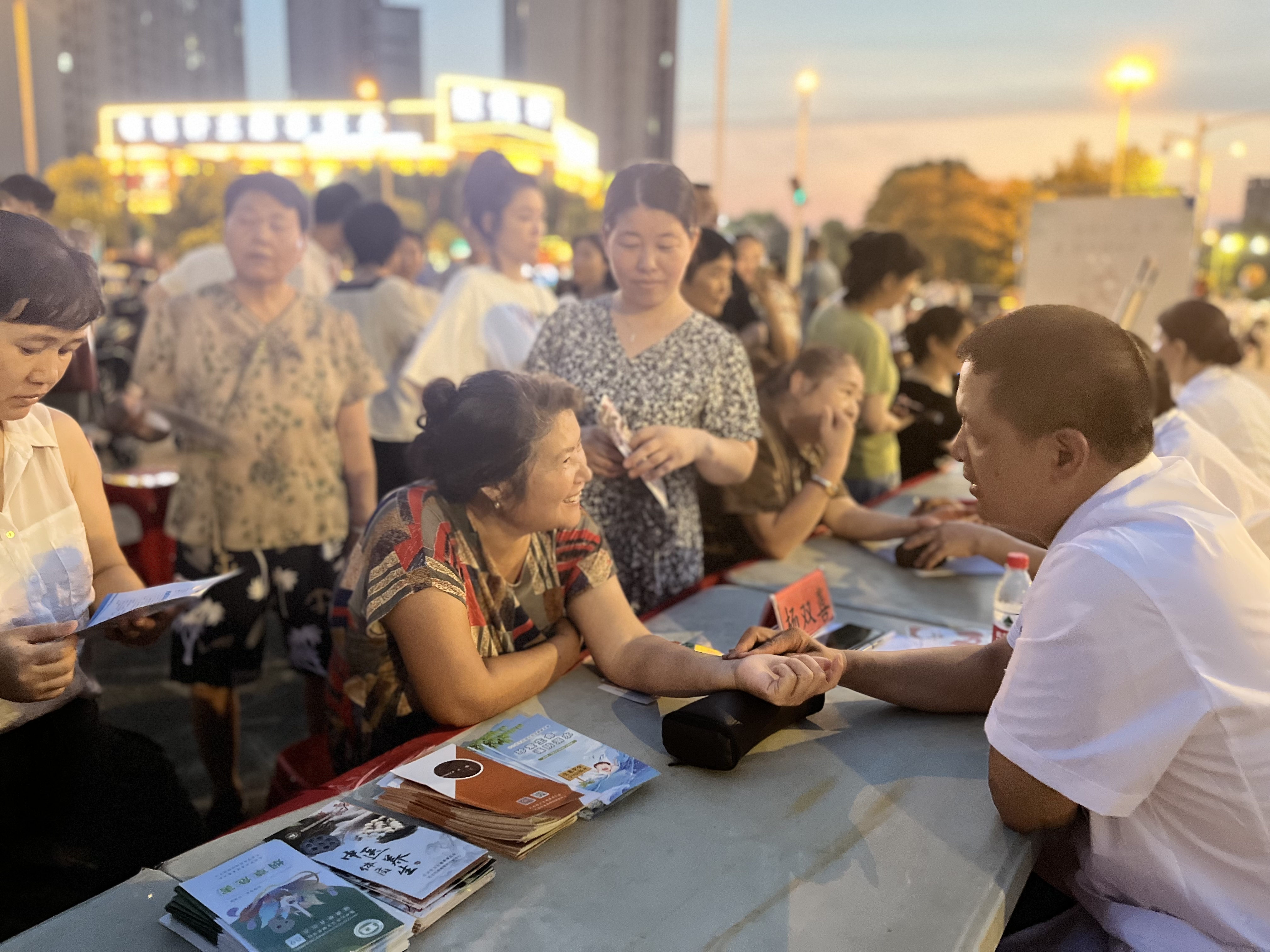 晚上六點半,現(xiàn)場人頭攢動,熱鬧非凡。長龍般的攤位上,眾多專業(yè)領(lǐng)域的骨干醫(yī)師齊聚一堂,為市民提供便利的咨詢和診療服務(wù)?;顒蝇F(xiàn)場共分為五個分區(qū),分別為義診區(qū)、體驗區(qū)、理療區(qū)、香囊區(qū)、健身區(qū)。在中醫(yī)藥文化科普區(qū),向群眾發(fā)放中醫(yī)藥文化科普知識宣傳手冊和宣傳扇,并準(zhǔn)備了常見中草藥向群眾講解辨識方法及主治功效。在中醫(yī)健康養(yǎng)生茶飲區(qū),社區(qū)精心熬制綠豆湯養(yǎng)生茶飲,群眾免費飲用。