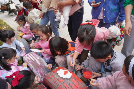活動中,由社區(qū)和物業(yè)在轄區(qū)內(nèi)收集而來的廢舊輪胎成為本場活動的主角,參與者們用顏料、舊刷子等,通過加工上色、移植路邊的野花等,在現(xiàn)場開展DIY輪胎小花園,使孩子們在創(chuàng)作體驗中感受到綠色環(huán)保的生活方式,知曉廢物利用所帶來的社會價值,體驗變廢為寶的樂趣,同時向大家宣傳垃圾分類、廢舊物品回收再利用的重要意義。