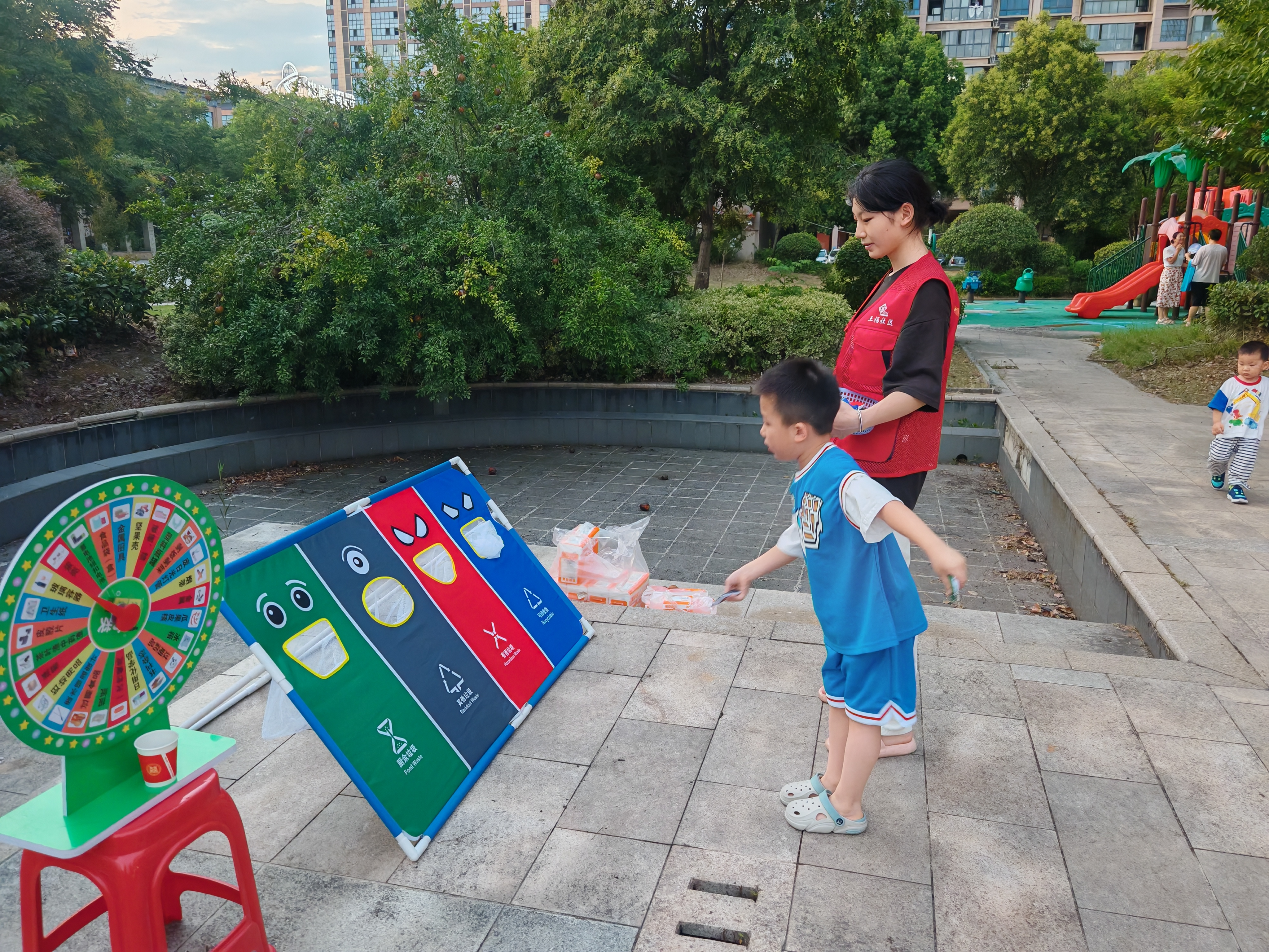 現(xiàn)場(chǎng)最受歡迎的環(huán)節(jié)是“垃圾分類沙包投擲”游戲。工作人員將分別對(duì)應(yīng)可回收物、廚余垃圾、有害垃圾和其他垃圾的游戲道具擺放在場(chǎng)地中央,每個(gè)投擲袋上都標(biāo)注著常見(jiàn)垃圾種類。居民領(lǐng)取彩色沙包后,需根據(jù)沙包上的垃圾名稱,準(zhǔn)確投擲到對(duì)應(yīng)的分類袋中。“塑料瓶是可回收物,要投藍(lán)色袋!”“過(guò)期藥品是有害垃圾,投紅色袋!” 孩子們?cè)诩议L(zhǎng)的耐心指導(dǎo)下認(rèn)真投擲,現(xiàn)場(chǎng)歡呼聲、喝彩聲此起彼伏。成功投中的小朋友舉著沙包興奮地說(shuō):“玩游戲就能學(xué)會(huì)垃圾分類,太有意思啦!”