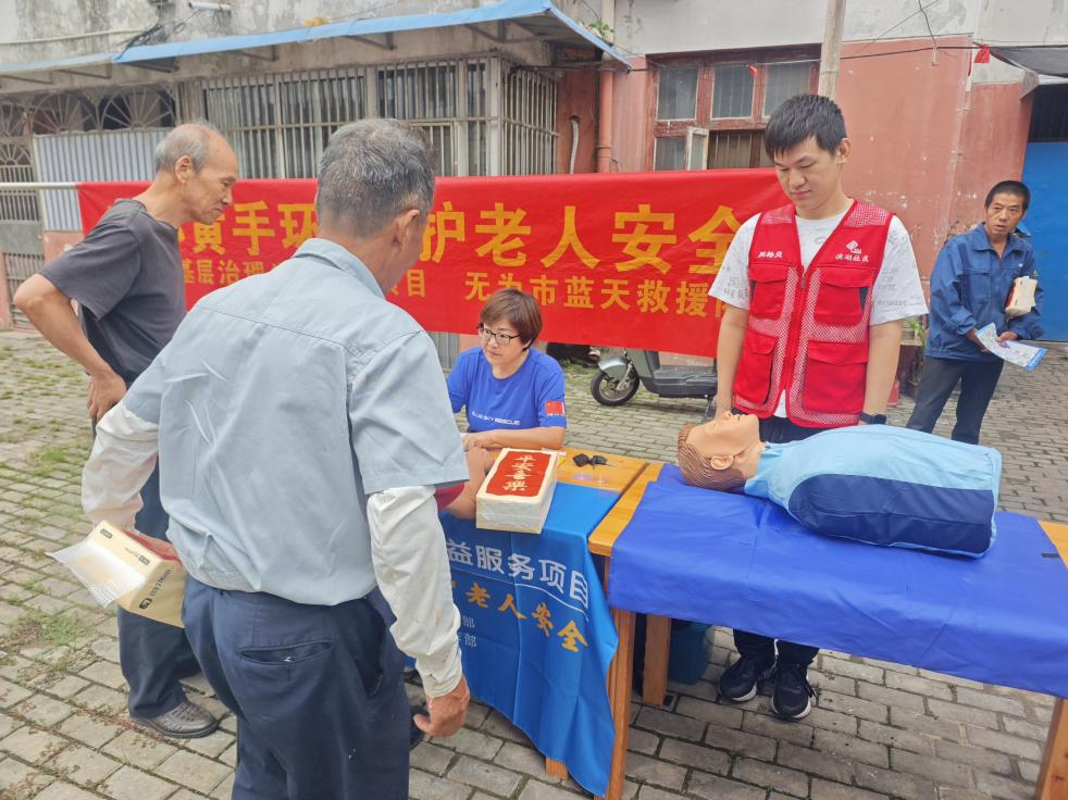 隨后,藍天救援隊的杜玉芳老師為有需要的老年居民免費辦理并佩戴黃手環(huán)。她一邊耐心地為老人調(diào)整手環(huán)的松緊度,確保佩戴舒適,一邊細致地講解使用方法,還通過現(xiàn)場模擬演示,讓老人們能更直觀地掌握操作要點。