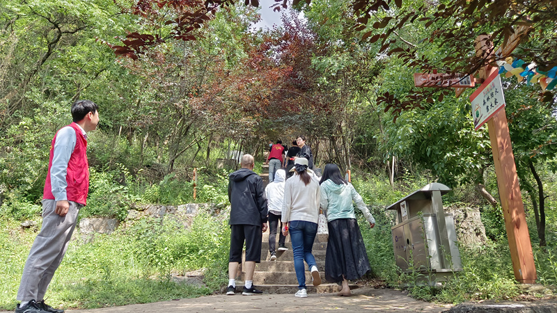 志愿者說道:“各位旅客朋友們,洞內(nèi)景點到此參觀結束,在我左手邊這扇門是通往下泊山的,感興趣的朋友們可以由這條通道登至山頂欣賞周邊景色?!币猹q未盡的游客們迎難而上,先后登上山頂,在涼亭中納涼靜觀,感受自然的饋贈。