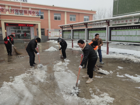 圖為定興村兩委班子與志愿者一道參與掃雪除冰行動(dòng)。