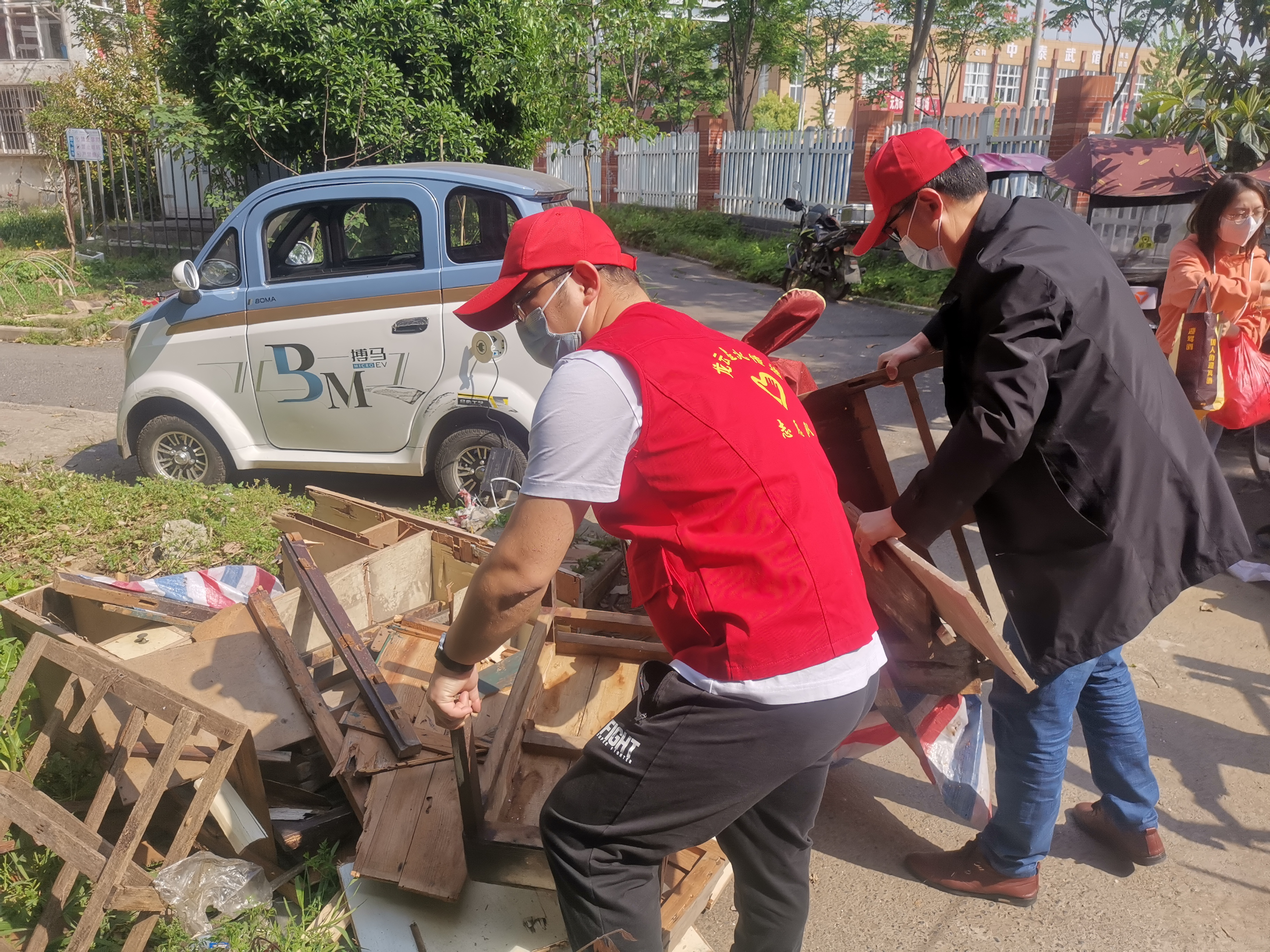 圖為龍?jiān)粕鐓^(qū)志愿者對(duì)轄區(qū)雜物進(jìn)行清理