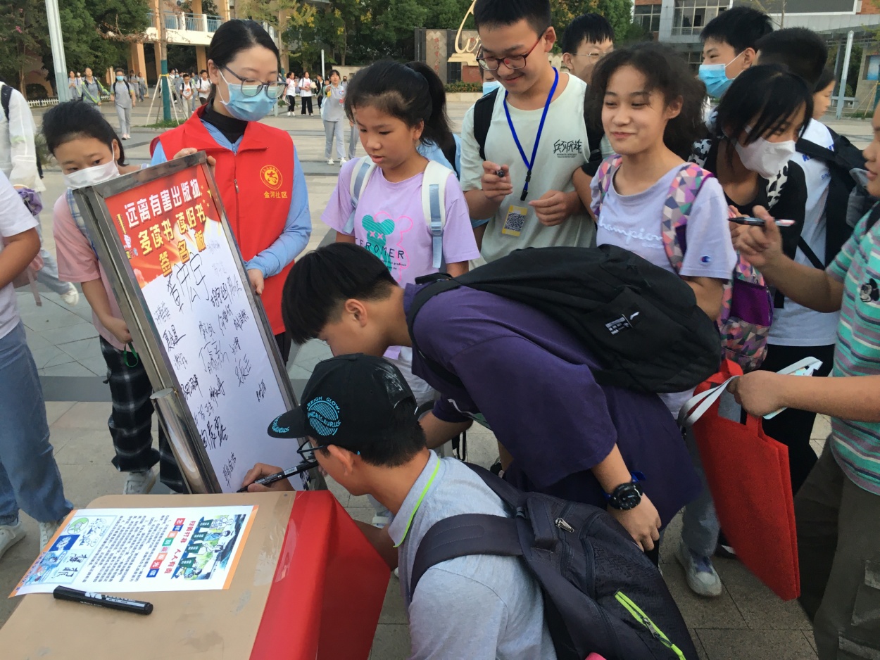 活動(dòng)現(xiàn)場,一邊社區(qū)志愿者和派出所民警向?qū)W生發(fā)放“掃黃打非”宣傳單頁,講解什么是“掃黃打非”,如何分辨、選擇正版圖書和“掃黃打非”相關(guān)法律法規(guī)知識(shí),教育學(xué)生們健康綠色上網(wǎng),不進(jìn)游戲廳、網(wǎng)吧,不瀏覽涉黃網(wǎng)站和網(wǎng)頁;堅(jiān)決抵制購買盜版書籍、非法出版物等,在發(fā)現(xiàn)“黃”“非”等出版物時(shí)要第一時(shí)間向所在派出所或社區(qū)舉報(bào)。同時(shí),學(xué)生們也集體承諾并在簽名版上簽下自己的姓名。