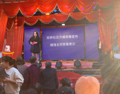 活動(dòng)過(guò)程中,雙橋社區(qū)工作人員及禁毒志愿者在舞臺(tái)上借助舞臺(tái)向居民群眾展示毒品知識(shí),介紹毒品的種類,詳細(xì)講解吸毒、販毒的危害性,同時(shí)社區(qū)工作者向居民群眾發(fā)放禁毒宣傳單,告誡廣大居民朋友要提高對(duì)誘惑的警惕性,不要輕信謊言等。