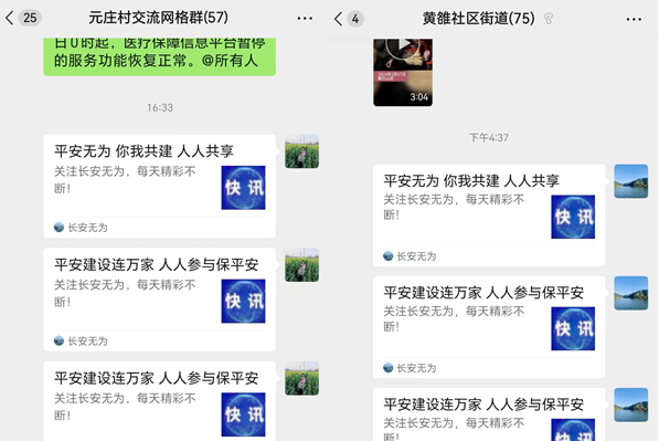 黃雒堅(jiān)持線上線下相結(jié)合,線下利用電子屏、社區(qū)喇叭循環(huán)播放平安建設(shè)宣傳內(nèi)容,張貼宣傳海報(bào)、橫幅;線上搭建宣傳“網(wǎng)絡(luò)陣地”,充分利用微信工作群、朋友圈等載體,及時(shí)發(fā)布平安建設(shè)的信息、動(dòng)態(tài)與成效。