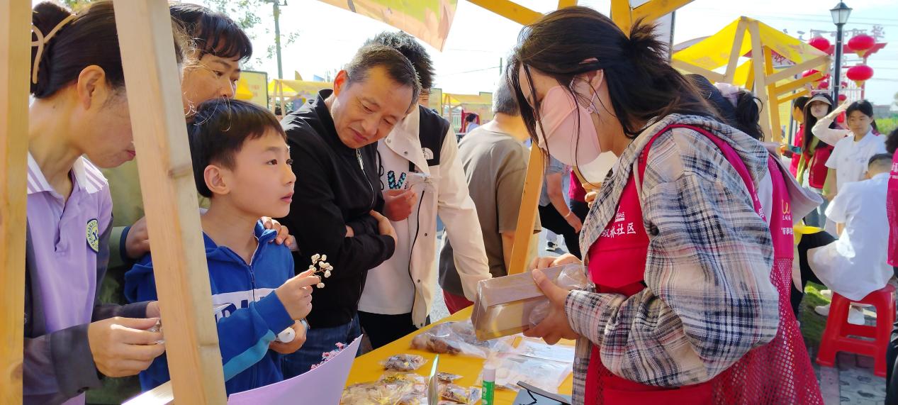 傳統(tǒng)技藝區(qū)更是展現(xiàn)了傳統(tǒng)文化的魅力。巧手生花慶豐收,居民們體驗(yàn)傳統(tǒng)絨花技藝的美妙,將制作好的絨花精心包裝成花束,為豐收增添了美好的寓意。以珠為媒,以扇為介,將社區(qū)文創(chuàng)與社區(qū)實(shí)際相結(jié)合,通過精美的串珠、漆扇等小禮品為媒介,讓居民們?cè)谂笥讶Πl(fā)送防溺水、掃黃打非、垃圾分類等公益口號(hào),換取漆扇或者串珠掛件,探索出新穎而有效的政策宣傳方式。