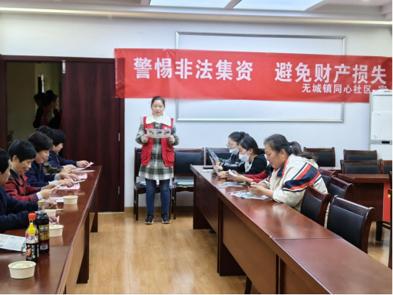 11月7日,無城鎮(zhèn)同心社區(qū)在二樓會議室開展了“警惕非法集資 避免財產(chǎn)損失”宣傳活動。