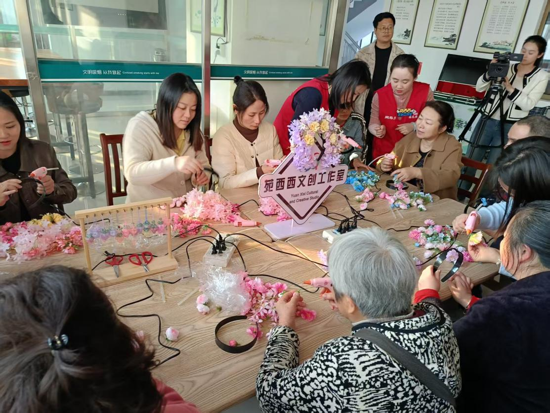 非遺簪花環(huán)節(jié)堪稱點睛之筆。苑西西文創(chuàng)工作室老師細說簪花淵源,巧手示范間,布料、絲線化作雅致雛形。志愿者一對一幫扶,在指尖流轉(zhuǎn)間,一朵朵獨一無二的簪花悄然綻放,既承載著傳統(tǒng)文化的韻味,更凝結(jié)著參與者的專注與喜悅?;顒游猜?,眾人手持簪花合影,定格下這份溫馨與榮光。