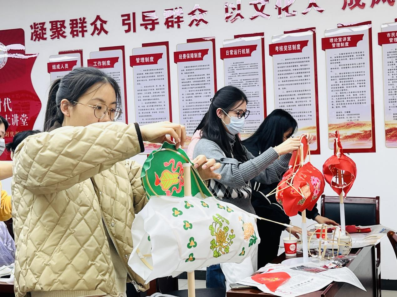 “無為魚燈”起源于安徽無為,于2011年被列入國家級非物質(zhì)文化遺產(chǎn)名錄。課堂之上,氛圍熱烈而有序,蔣章先生先以千年魚燈的歷史淵源開篇,從北宋進獻宮廷的佳話講到“紅燈一繞,祈福納祥”的民俗傳統(tǒng),再到描繪“鳳簫聲動,玉壺光轉(zhuǎn),一夜魚龍舞”的詩詞意境,將無為魚燈承載的民生期盼與文化基因娓娓道來。理論講解完畢,實操環(huán)節(jié)緊鑼密鼓展開。竹篾彎折需剛?cè)岵?,蒙紙定型要細致入微,從魚身架構(gòu)到魚尾弧度,從魚鰭雕琢到魚頭塑形,蔣章先生手把手示范要領(lǐng),糾正學(xué)員動作偏差;學(xué)員們凝神專注,或度量尺寸或穿插編織或裱糊蒙皮,從生疏試探到嫻熟操作,指尖翻飛間,一根根竹篾宛轉(zhuǎn)成型,一張張“魚皮”賦予靈性。當(dāng)燈光嵌入骨架,一盞盞造型靈動的魚燈次第點亮,光影流轉(zhuǎn)中,傳統(tǒng)技藝與青春活力碰撞出耀眼火花。