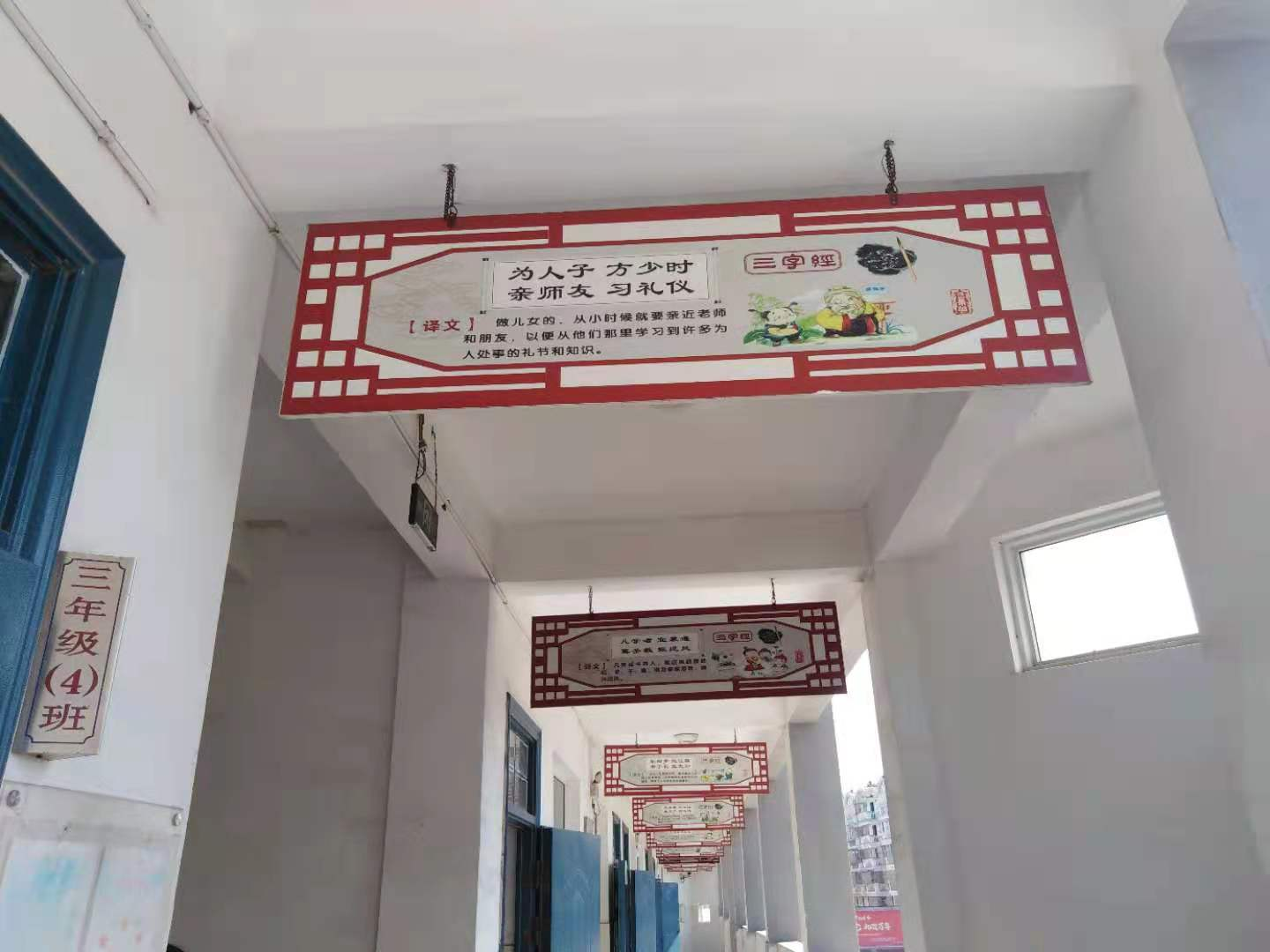經(jīng)典綻放校園,美德滋潤心田。金色陽光下,高溝鎮(zhèn)渡江希望小學(xué),文明中飽含希望,寧靜中充滿生機(jī)。“勿以惡小而為之,勿以善小而不為”、“誰言寸草心,報(bào)答三春暉”、“讀萬卷書,行萬里路”、“先天下之憂而憂,后天下之樂而樂”、“為人子,方少時(shí),親詩友,習(xí)禮儀”……經(jīng)典文化在校園綻放,啟迪心智字字圓潤,句句靈動(dòng)。近年來,高溝鎮(zhèn)學(xué)校不斷強(qiáng)化文明校園建設(shè),落實(shí)素質(zhì)教育,讓濃濃書香陪伴孩子健康快樂成長,編織夢(mèng)想,放飛希望。本著教書育人辦學(xué)理念,圍繞“三風(fēng)一訓(xùn)(學(xué)風(fēng)、教風(fēng)、校風(fēng)、校訓(xùn))”辦學(xué)宗旨,落實(shí)目標(biāo),細(xì)化舉措,著力打造。各學(xué)校結(jié)合校園實(shí)際將經(jīng)典國學(xué)與未成年人思想道德建設(shè)有機(jī)結(jié)合起來,精心布置,彰顯特色,鍛造精品。利用宣傳欄、樓道、圍墻、電子顯示屏、宣傳畫、宣傳牌等有效載體,展示經(jīng)典國學(xué),傳播中華文化,弘揚(yáng)文明美德。格言警句、經(jīng)典名篇、《論語》、《三字經(jīng)》等經(jīng)典詩文、名人名言、國粹精品、安全常識(shí),靜靜展現(xiàn)于校園一角,散發(fā)出濃濃的道德氣息。國學(xué)經(jīng)典文化,美化著校園環(huán)境,啟迪學(xué)子智慧,文明著學(xué)子的心靈。春風(fēng)化雨,潤德無聲。