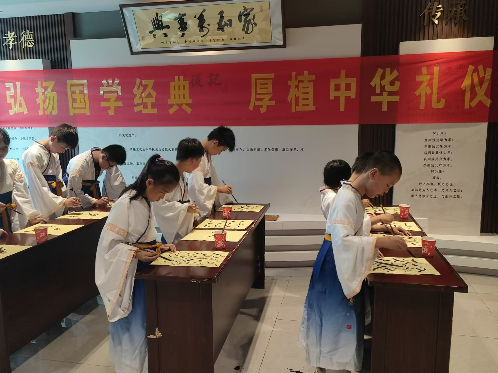 舉辦特色典禮,傳承文化基因。每年九月開(kāi)學(xué)之際,蜀山鎮(zhèn)關(guān)河村都會(huì)在孝廉文化館舉辦大型孝廉文化節(jié)日慶典——秋季“入學(xué)禮”活動(dòng)?;顒?dòng)現(xiàn)場(chǎng),適齡學(xué)子們身著漢服,舉行莊重的“敲鼓入門(mén)”儀式,寓意著開(kāi)啟求知奮進(jìn)的學(xué)習(xí)之路。隨后,學(xué)子們靜心聆聽(tīng)古代先賢的孝廉故事與法治思想,在“墨香傳法”環(huán)節(jié),他們滿懷敬畏地書(shū)寫(xiě)對(duì)法治的承諾,并在簽名墻上鄭重地留下自己的姓名。這一活動(dòng)不僅讓孩子們?cè)趦x式中感受傳統(tǒng)文化的魅力,更在他們心中種下了孝廉與法治的種子。