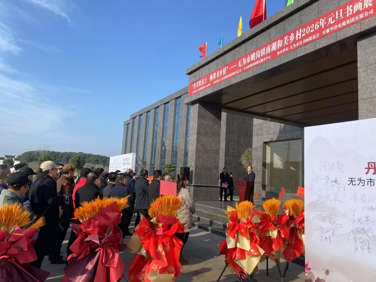 為深入貫徹落實鄉(xiāng)村振興戰(zhàn)略,弘揚中華優(yōu)秀傳統(tǒng)文化,豐富轄區(qū)群眾的精神文化生活,2025年12月28日9時,由姚溝鎮(zhèn)人民政府主辦,姚溝鎮(zhèn)南湖村、姚溝鎮(zhèn)便民服務中心承辦的“丹青繪沃土翰墨書鄉(xiāng)情”——無為姚溝鎮(zhèn)南湖和美鄉(xiāng)村2026年元旦書畫展在安徽華津電纜集團有限公司隆重開幕。全市書畫愛好者及當地群眾共計200余人參加了開幕式。