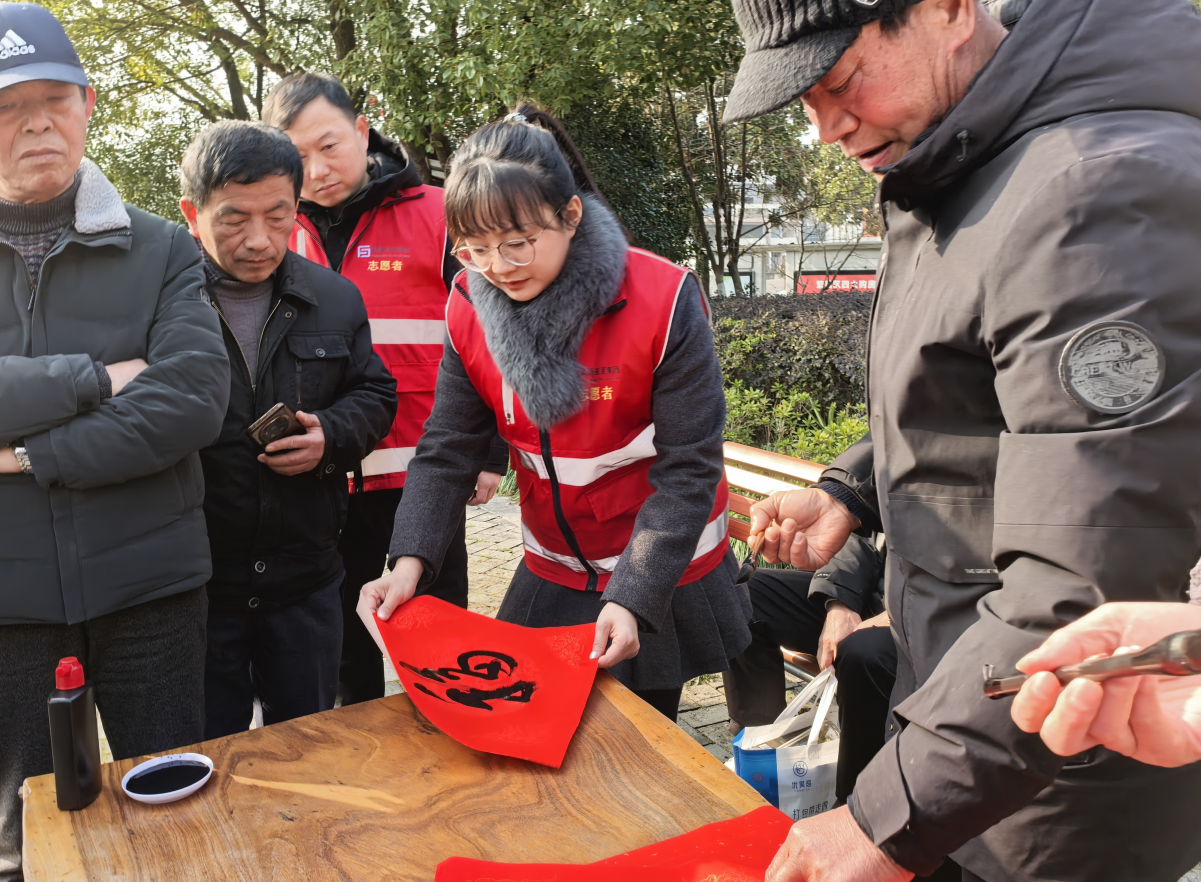 活動現(xiàn)場暖意融融,志愿者們身著紅馬甲穿梭其間、熱情服務。大紅春聯(lián)鋪展于桌,書法愛好者揮毫潑墨,墨香陣陣間,一副副寓意吉祥的春聯(lián)躍然紙上,居民們圍攏周邊認真挑選;志愿理發(fā)師手法嫻熟,耐心為居民修剪發(fā)型,老人們理完發(fā)后連連道謝;愛心義診區(qū)里,志愿者們量血壓、答疑解惑,普及健康知識……現(xiàn)場歡聲笑語不斷,處處洋溢著濃濃的溫情與年味。