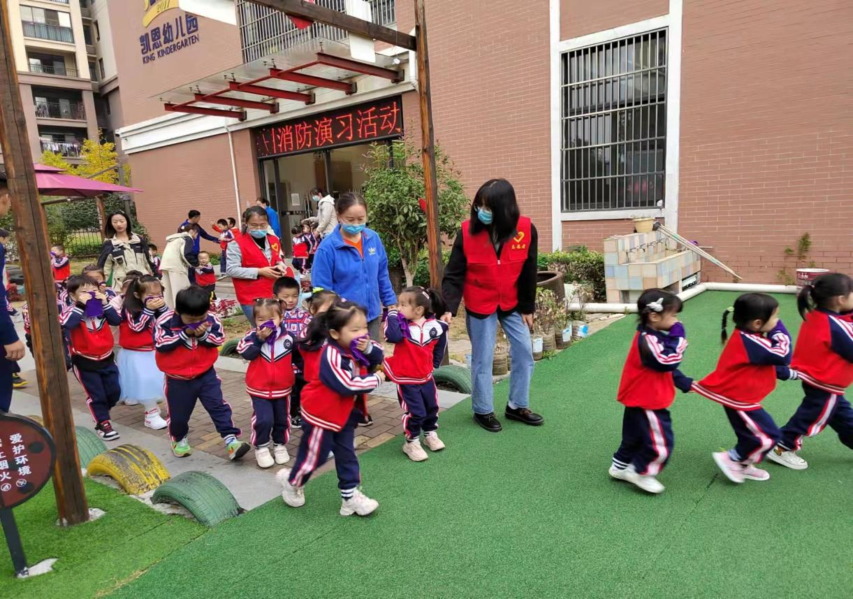 幼兒園廣播響起緊急火災(zāi)警報聲,全體老師和志愿者有序組織孩子們迅速捂住口鼻,蜷縮身體,井然有序地按照消防逃生路線進行疏散。整個過程用時1分55秒,孩子們?nèi)堪踩冯x到了安全地帶,教師立即清點人數(shù)、排好隊伍,沒有發(fā)生任何擁擠、跌倒等現(xiàn)象。