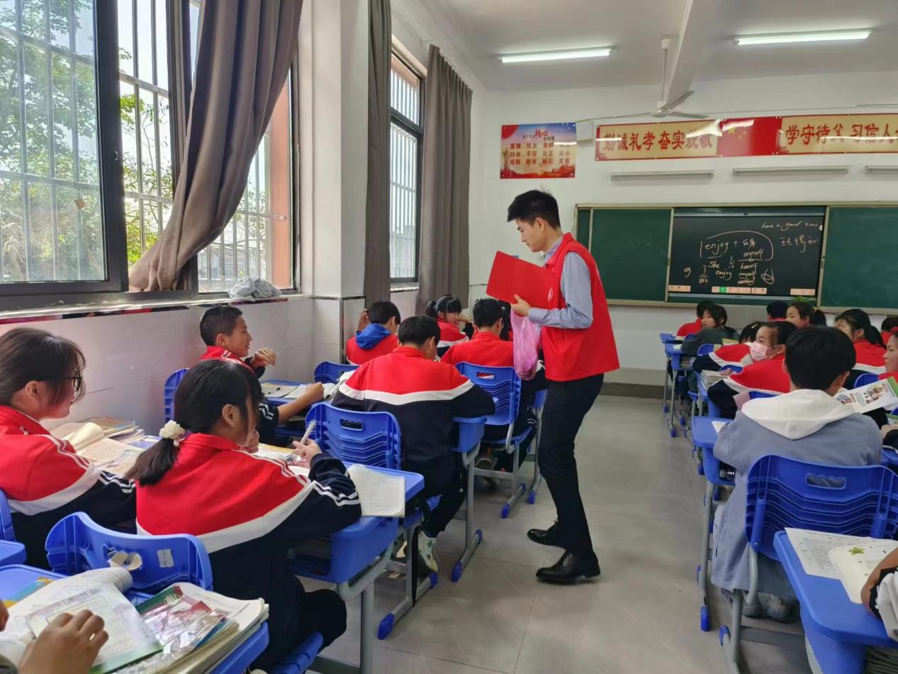 志愿者為積極參與掃黃打非知識競答的學(xué)生發(fā)放小禮品