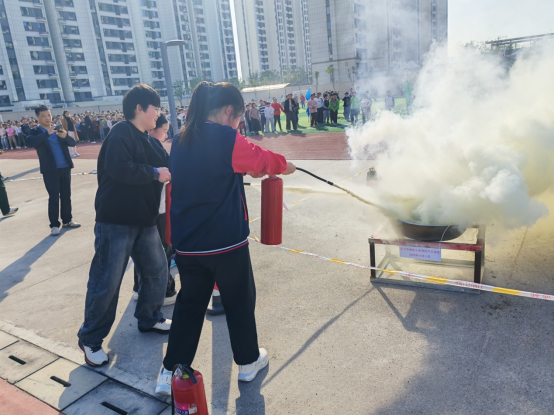 隨后,周主任進行干粉滅火器實操演示?!耙惶岫稳账膲?!”他邊講解操作口訣,邊示范如何對準(zhǔn)火焰根部噴射。五六年級學(xué)生代表在教師指導(dǎo)下輪流體驗滅火操作,從最初的緊張到逐漸熟練,切實掌握了滅火器使用技能。