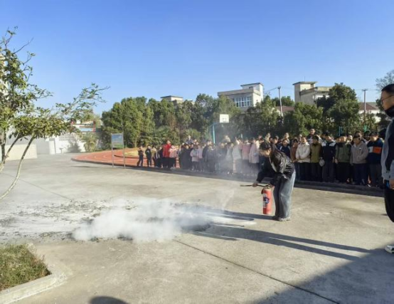 隨后學校老師現(xiàn)場展示了干粉滅火器的正確使用方法,通過“提、拔、握、壓”四個步驟的清晰講解和精準操作,向師生們演示了如何迅速撲滅明火,并讓學生進行實際操作?!?/p>