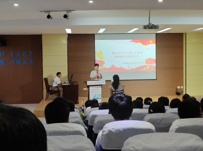 活動中,主持人向現(xiàn)場的全體同學(xué)講述身邊的先進事跡,通過身邊的好人好事來教育學(xué)生深刻領(lǐng)悟社會主義核心價值觀的豐富內(nèi)涵,養(yǎng)成良好的道德行為規(guī)范,既要做中華傳統(tǒng)美德的傳承者,也要做以“富強、民主、文明、和諧;自由、平等、公正、法治;愛國、敬業(yè)、誠信、友善”為基本內(nèi)容的社會主義核心價值觀的小小踐行者,爭做新時代文明好少年。