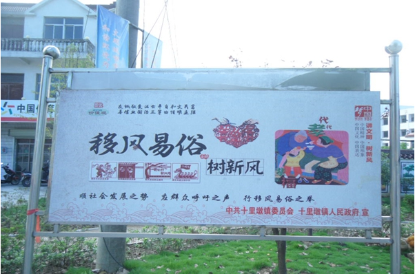 移風易俗,重在宣傳,貴在參與。該鎮(zhèn)結(jié)合美麗鄉(xiāng)村建設,創(chuàng)新方式方法,拓寬教育渠道,以講文明、樹新風公益廣告的宣傳為載體,倡導移風易俗,推進文明鄉(xiāng)風、文明家風的建設。公益廣告圖文并茂,成為弘揚美德、傳播文明新風的有效載體,深受老百姓的喜愛。該鎮(zhèn)公益廣告圍繞社會主義核心價值觀宗旨,倡樹文明新風,推進移風易俗,傳播社會正能量。文化墻、宣傳欄、公益廣告牌、電子顯示屏等成為移風易俗、講文明樹新風等文明用語的有效載體,文化廣場、農(nóng)家小院、道路沿線、小區(qū)綠化帶等場所,不難發(fā)現(xiàn)一處處文明標語、一行行道德文字。將移風易俗、鄰里友善、婚育新風、勤勞節(jié)儉、村規(guī)民約、好人文化等內(nèi)容,有機滲入到公益廣告中。不知不覺提高了市民的道德修養(yǎng),引導廣大市民踐行美德,告別陋習,防微杜漸,傳播文明。