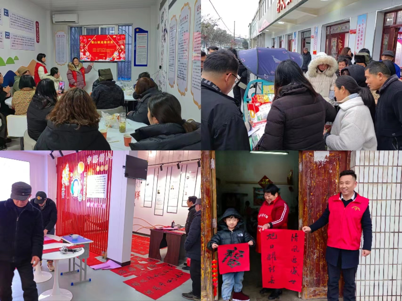 在道德大講堂宣講環(huán)節(jié),志愿者為前來(lái)參加活動(dòng)的群眾準(zhǔn)備了點(diǎn)心和茶水,宣講者講述張明、錢(qián)廣忠、潘禮俊等道德模范的好人事跡,號(hào)召大家向身邊的好人、道德楷模學(xué)習(xí),大家都備受鼓舞深受感動(dòng),紛紛表示要向好人學(xué)習(xí),爭(zhēng)做好人。志愿者通過(guò)現(xiàn)實(shí)案例講解引導(dǎo)群眾樹(shù)立婚喪嫁娶新風(fēng)尚,樹(shù)立艱苦樸素、勤儉節(jié)約的好習(xí)慣,破除封建迷信盲目攀比陳規(guī)陋習(xí),自覺(jué)抵制“黃賭毒”等理念得到了在場(chǎng)群眾的普遍認(rèn)同和贊賞。在隔壁的書(shū)畫(huà)展廳,特邀的書(shū)法家們揮毫潑墨,一會(huì)兒的工夫,一幅幅洋溢著節(jié)日喜慶氣氛的春聯(lián)躍然紙上,讓在場(chǎng)群眾贊不絕口,紛紛豎起大拇指點(diǎn)贊?;顒?dòng)最后,志愿者向群眾贈(zèng)送了春聯(lián),并向困難群眾發(fā)放米面油等過(guò)節(jié)生活物資,送去節(jié)日的祝福,整場(chǎng)活動(dòng)洋溢著歡樂(lè)祥和溫馨喜慶的氣氛。