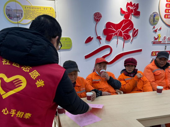 社區(qū)志愿者向環(huán)衛(wèi)工人宣傳暖民心政策